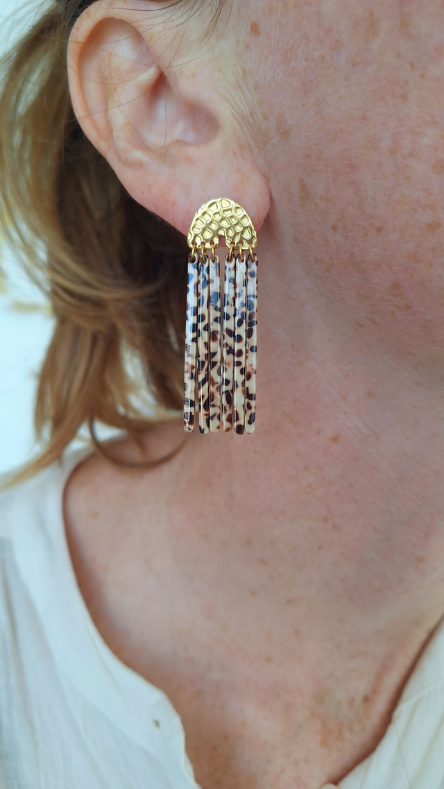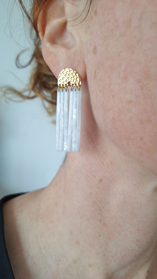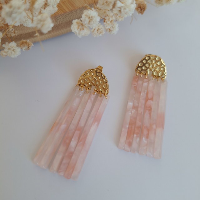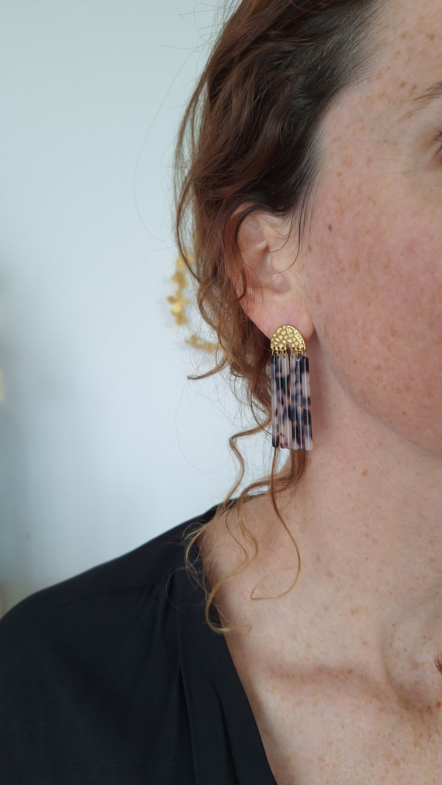 Les pendentifs en forme de tige sont en acétate de cellulose, une matière légère à porter et fabriquée à partir de matière naturelle.