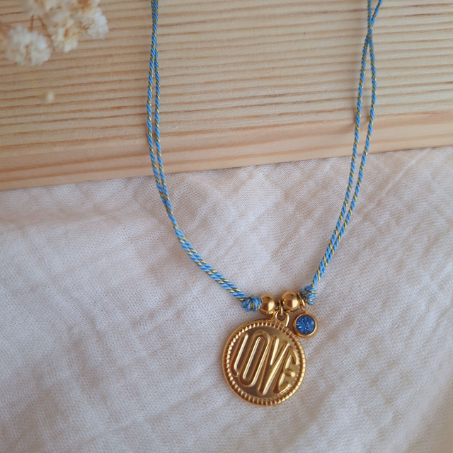 - monté sur une double cordelette en polyester et coton de couleur et doré, ici de couleur bleu ciel.